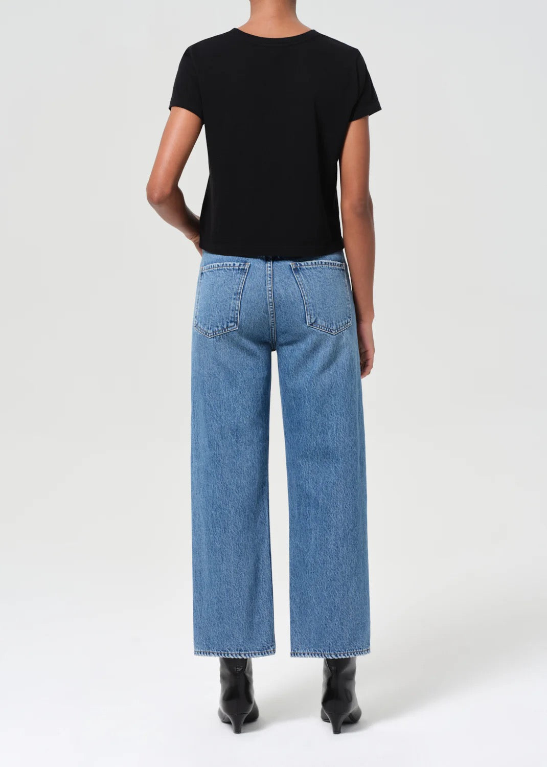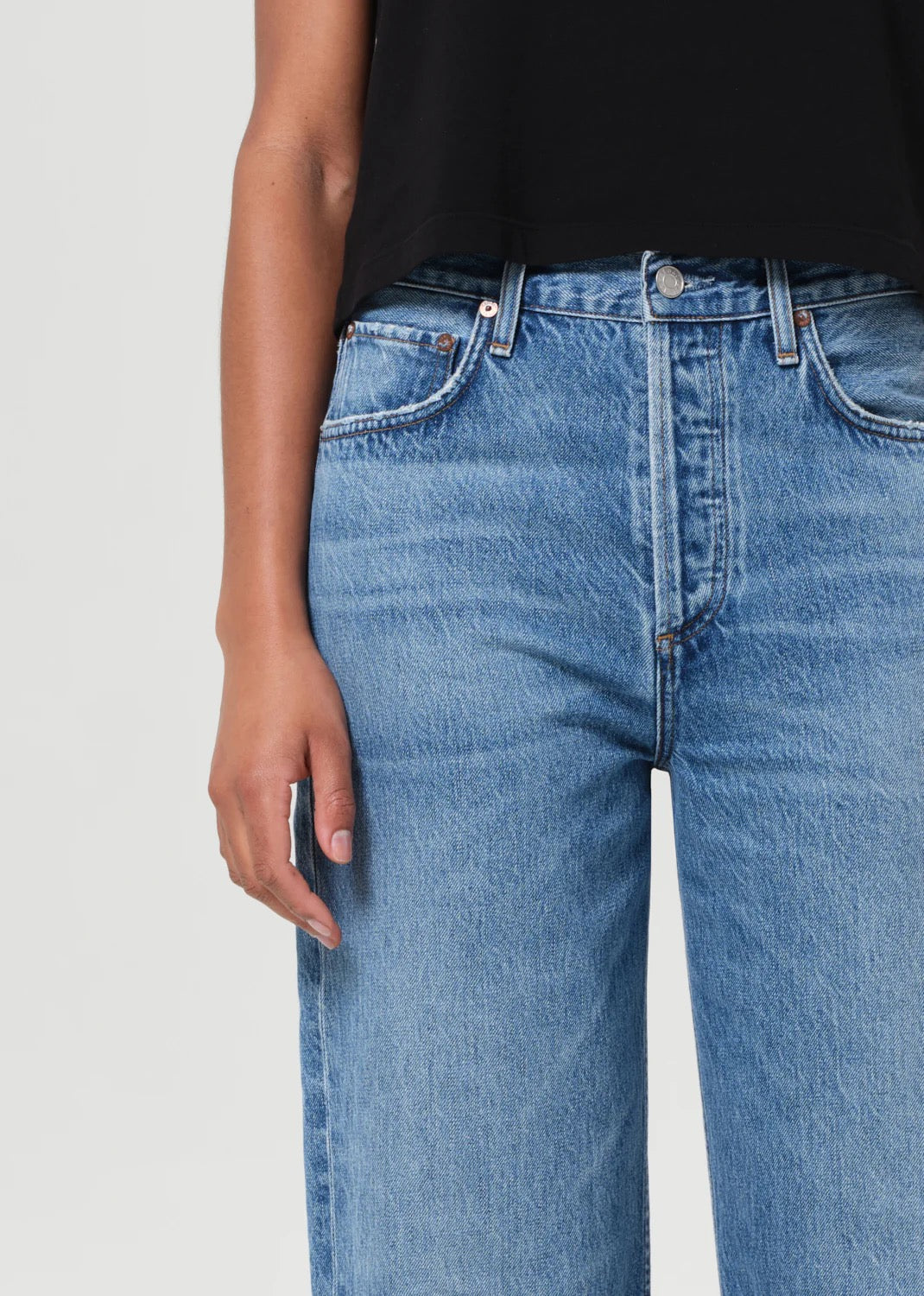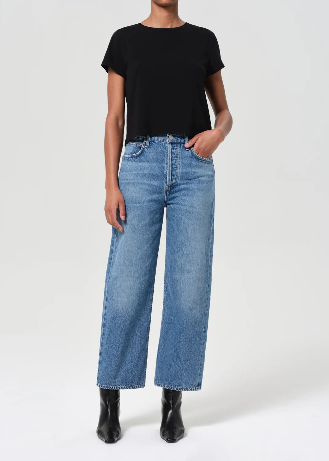 AGOLDE's Ren jeans from the Weightless Collection offer the perfect blend of comfort and style. Made from regenerative cotton, they feature a high-rise waist and cropped wide legs for a relaxed yet flattering silhouette. The lightweight fabric ensures all-day comfort, making them ideal for casual wear. Pair them with a half-tucked tee for a cool, effortless look.