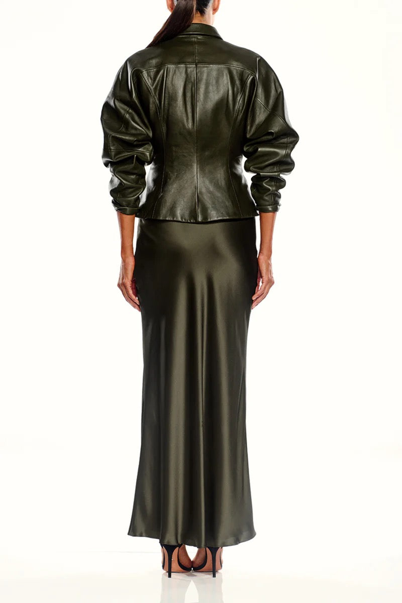 Fitted leather jacket in lambskin leather showcases a dramatic silhouette with balloon sleeves and dual ended zipper detail. Fully lined. Imported.